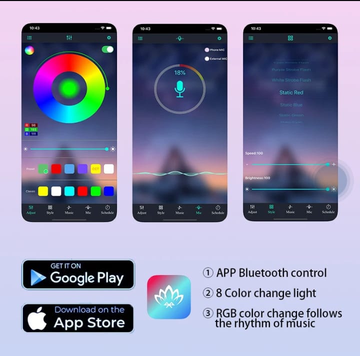 اس لائٹ کو آپ آسانی سے اپنے اسمارٹ فون کی Bluetooth ایپ کے ذریعے کنٹرول کر سکتے ہیں۔ رنگ اور لائٹنگ پیٹرنز اپنی پسند کے مطابق سیٹ کریں اور اپنی سواری کو مزید دلکش بنائیں۔ اس کا یونیورسل ڈیزائن ہر قسم کی بائیک اور کار کے لیے موزوں ہے جبکہ واٹر پروف فیچر اسے ہر موسم میں قابلِ اعتماد بناتا ہے۔